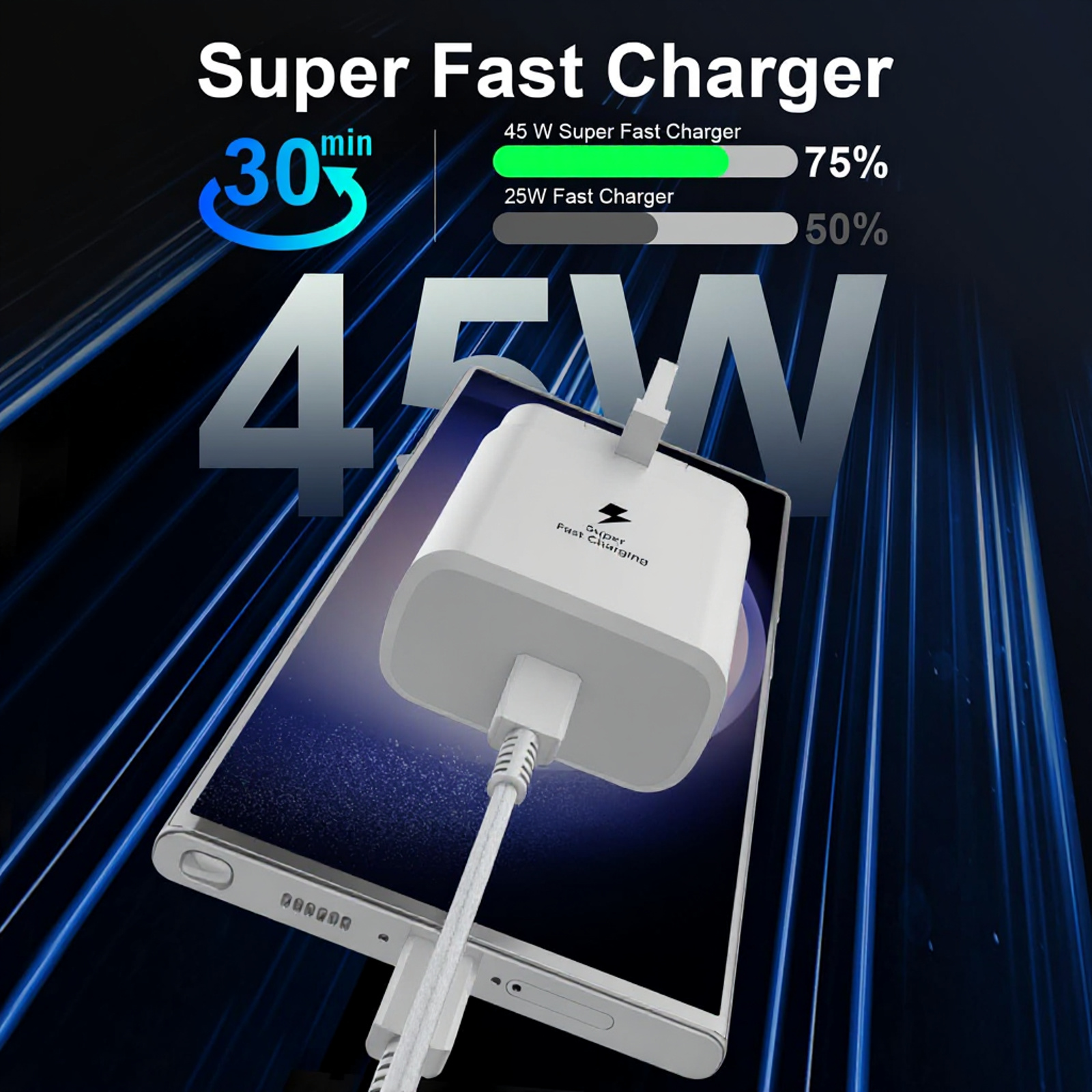 Power up quickly with the 45W Super Fast Charger (White) featuring a durable 1.5M cable. Designed for rapid, safe, and efficient charging of compatible smartphones, tablets, and other USB-C devices.